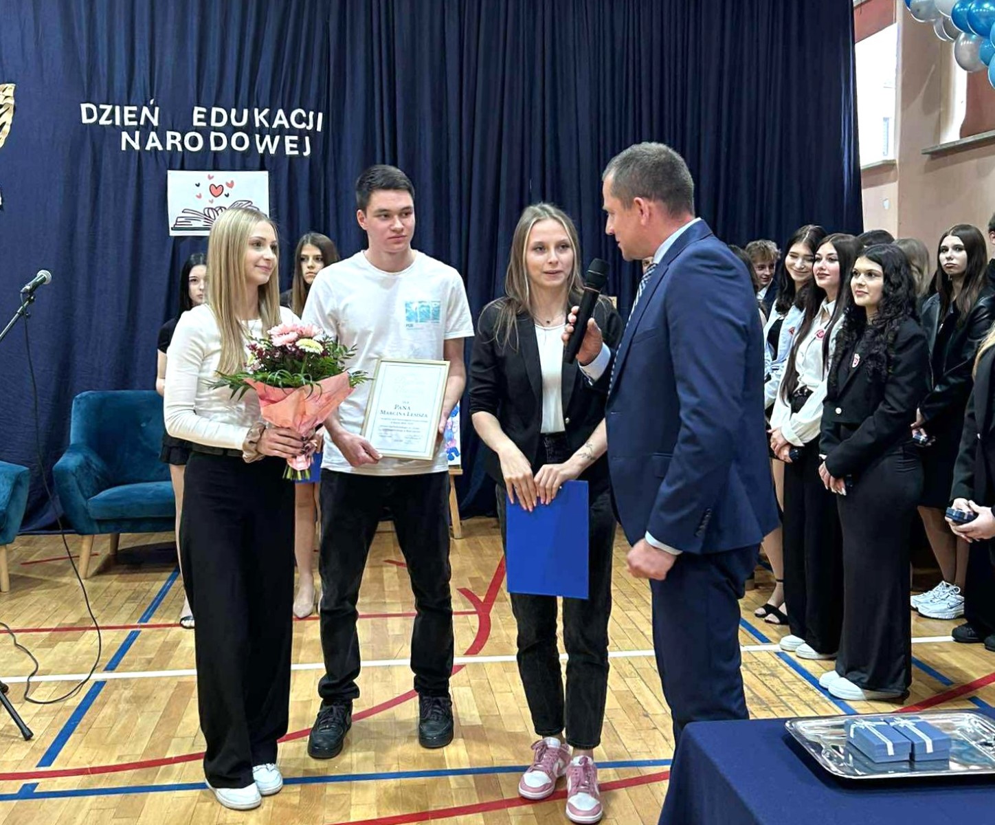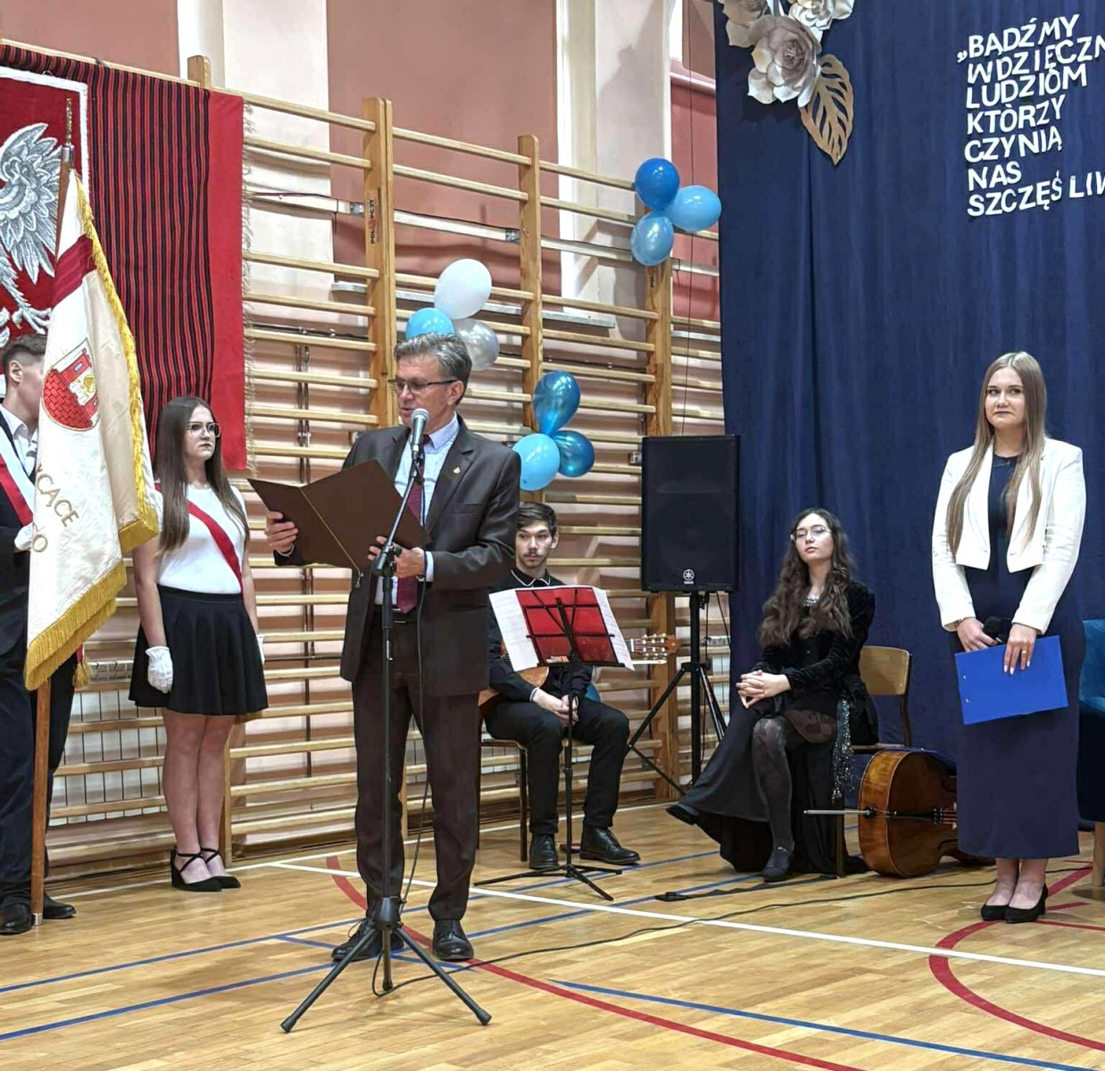 Podziękowania oraz życzenia złożył Dyrektor Szkoły - Pan Piotr Gajek. W krótkim przemówieniu podkreślił, jak ważna jest nauka, doskonalenie umiejętności i rozwój talentów. Podziękował nauczycielom, pracownikom obsługi i administracji, czego wyrazem stały się również wręczone przez Dyrektora nagrody.