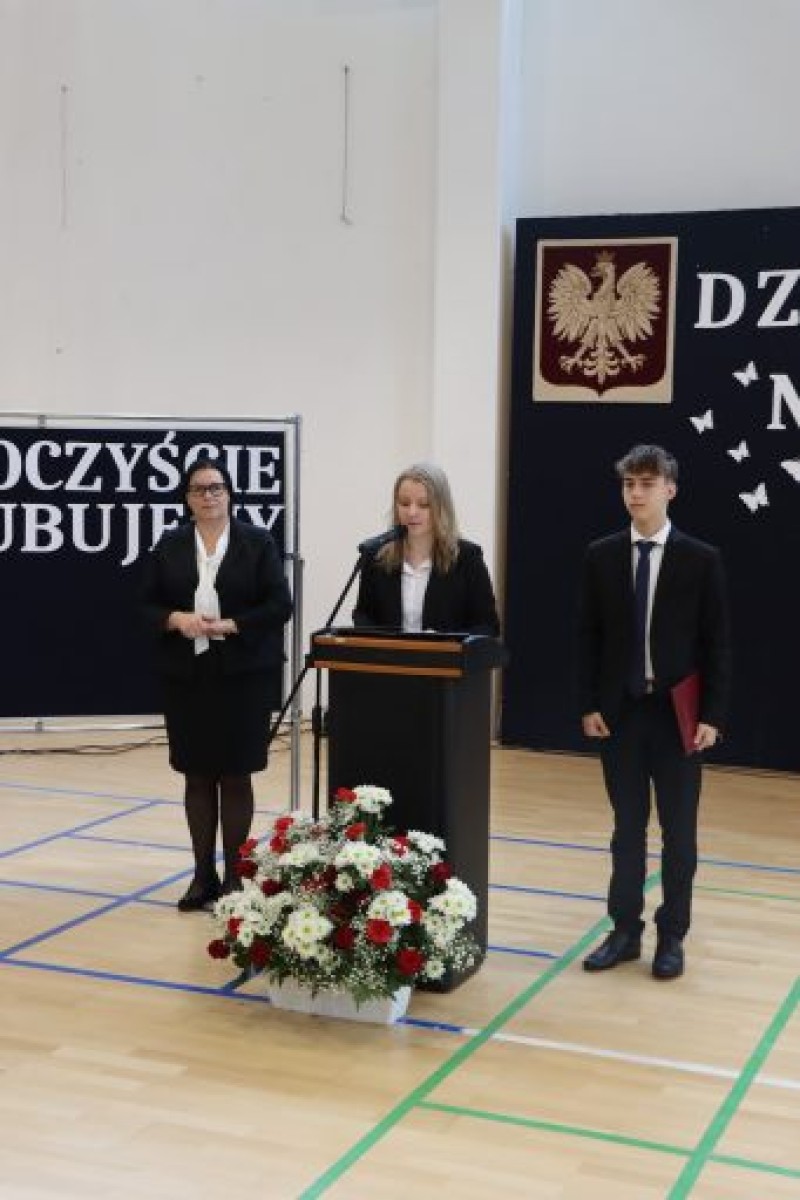Po wprowadzeniu pocztu sztandarowego i odśpiewaniu hymnu narodowego Dyrektor Szkoły Pani Agnieszka Prędota-Gad odczytała akt ślubowania, a reprezentanci klas pierwszych złożyli przysięgę na sztandar szkoły, w myśl roty zapewniając o szacunku i godnym reprezentowaniu Szkoły.