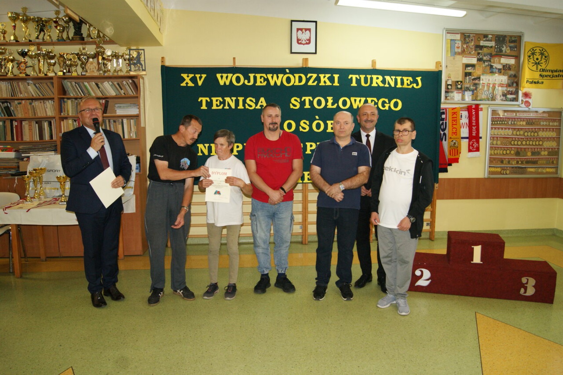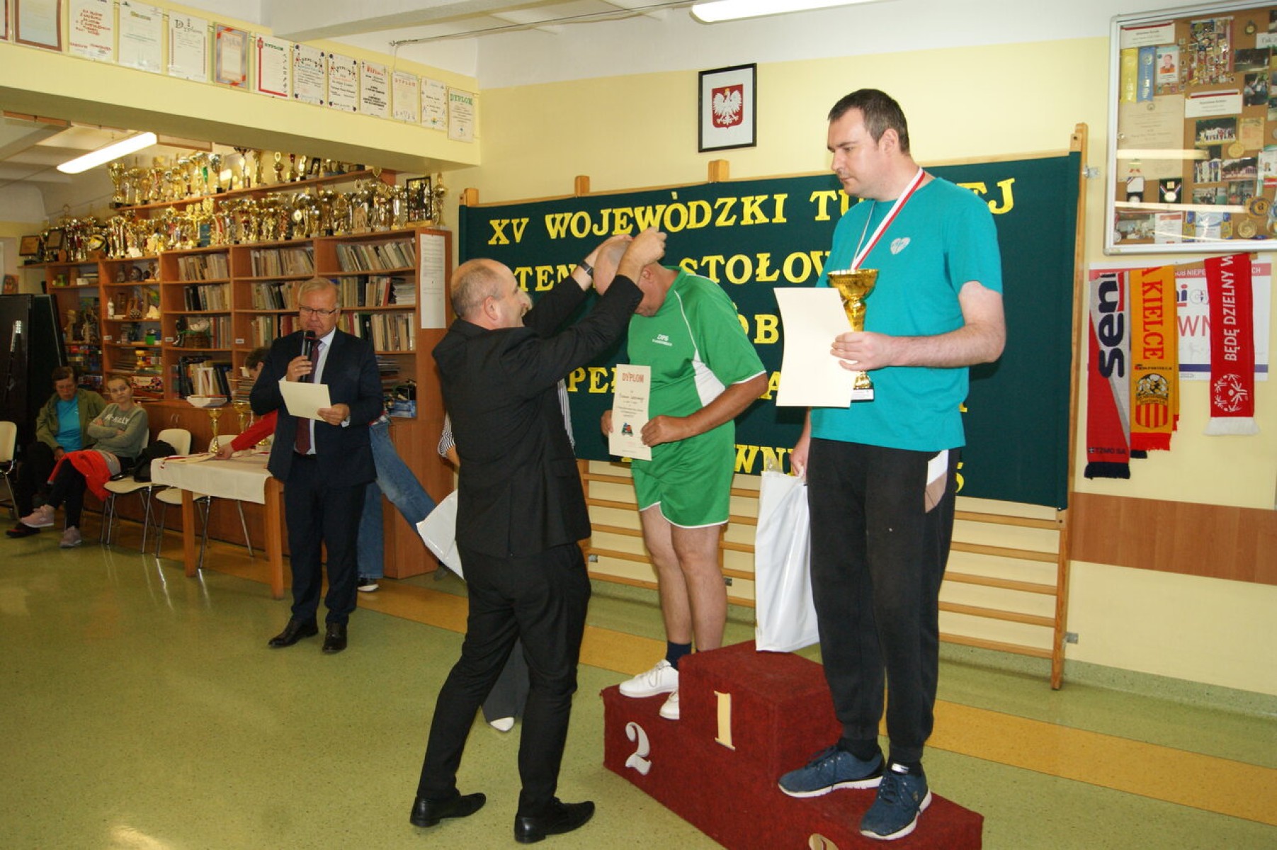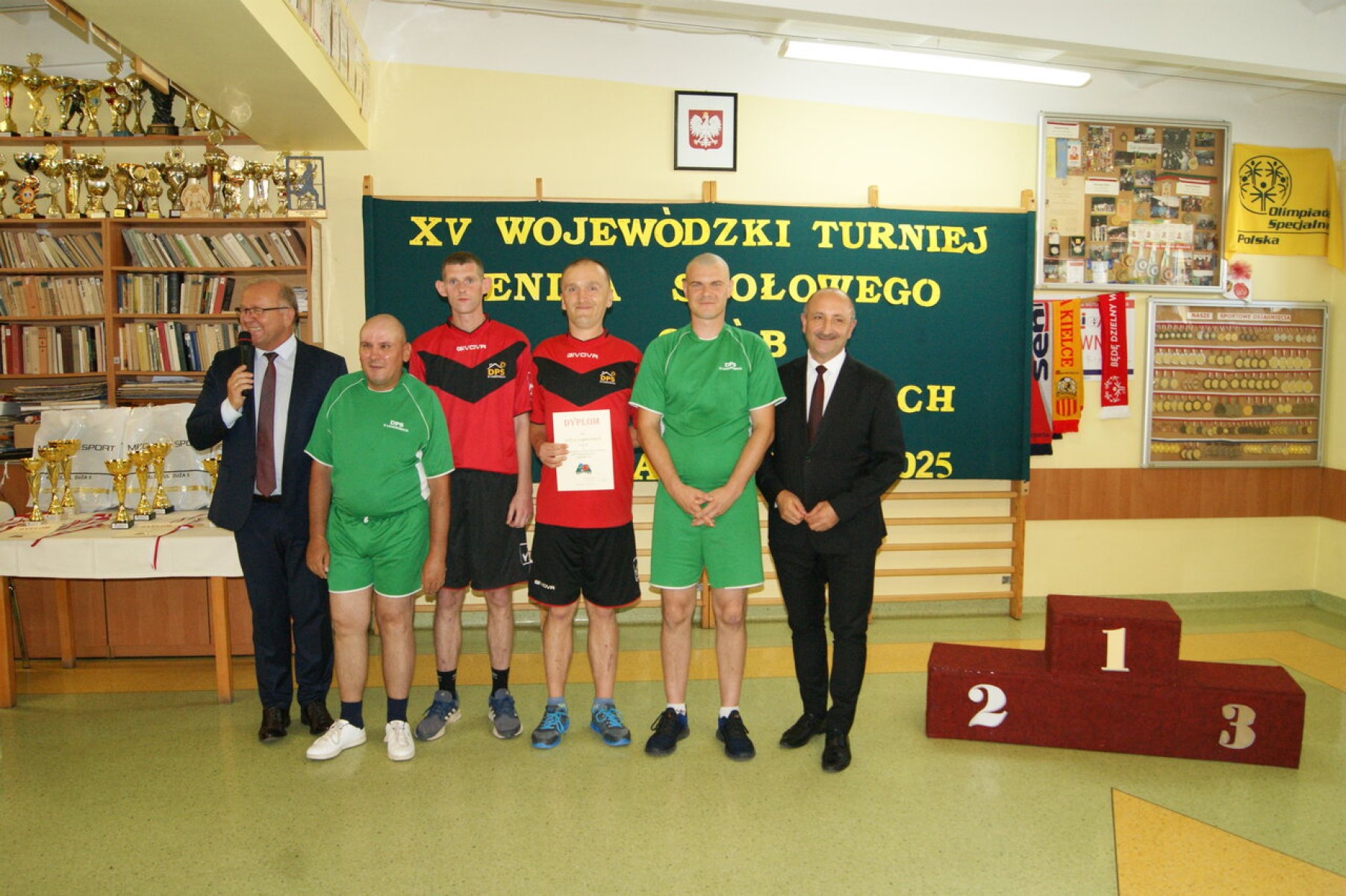 Dyplomy za udział w Turnieju, medale, puchary i nagrody rzeczowe najlepszym zawodnikom wręczył Członek Zarządu Powiatu Mariusz Ściana gratulując im sukcesu w tegorocznych zmaganiach. Dyplom dla najstarszego zawodnika otrzymał Pan Stanisław Kwiecień z ŚDS w Zreczu Dużym, który w wieku 85 lat aktywnie uczestniczy w wydarzeniach sportowych organizowanych przez placówki pomocy społecznej.