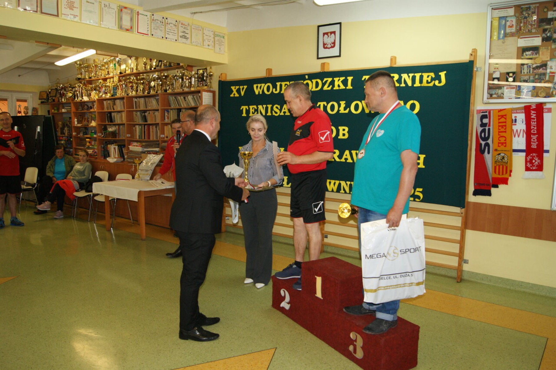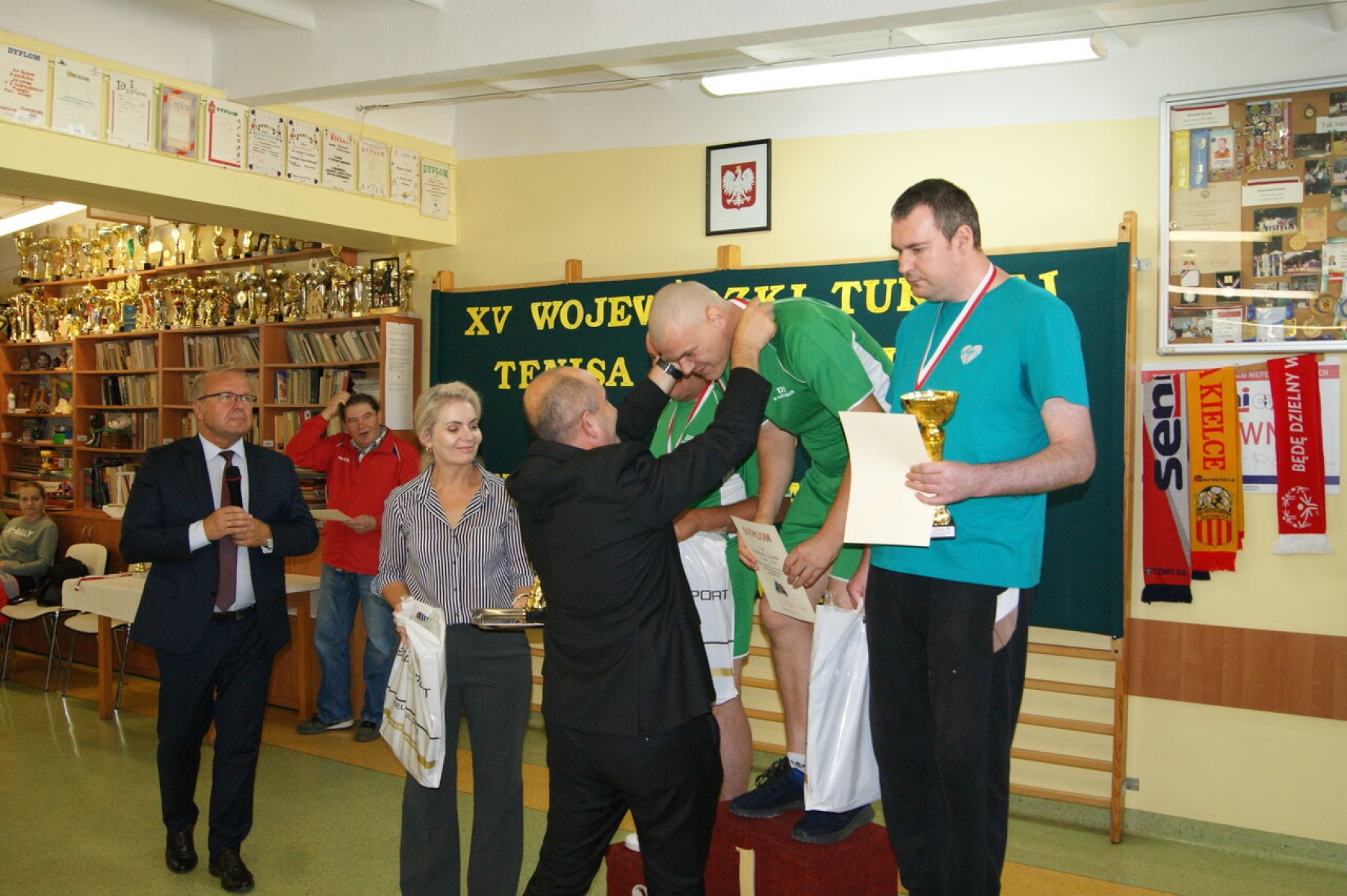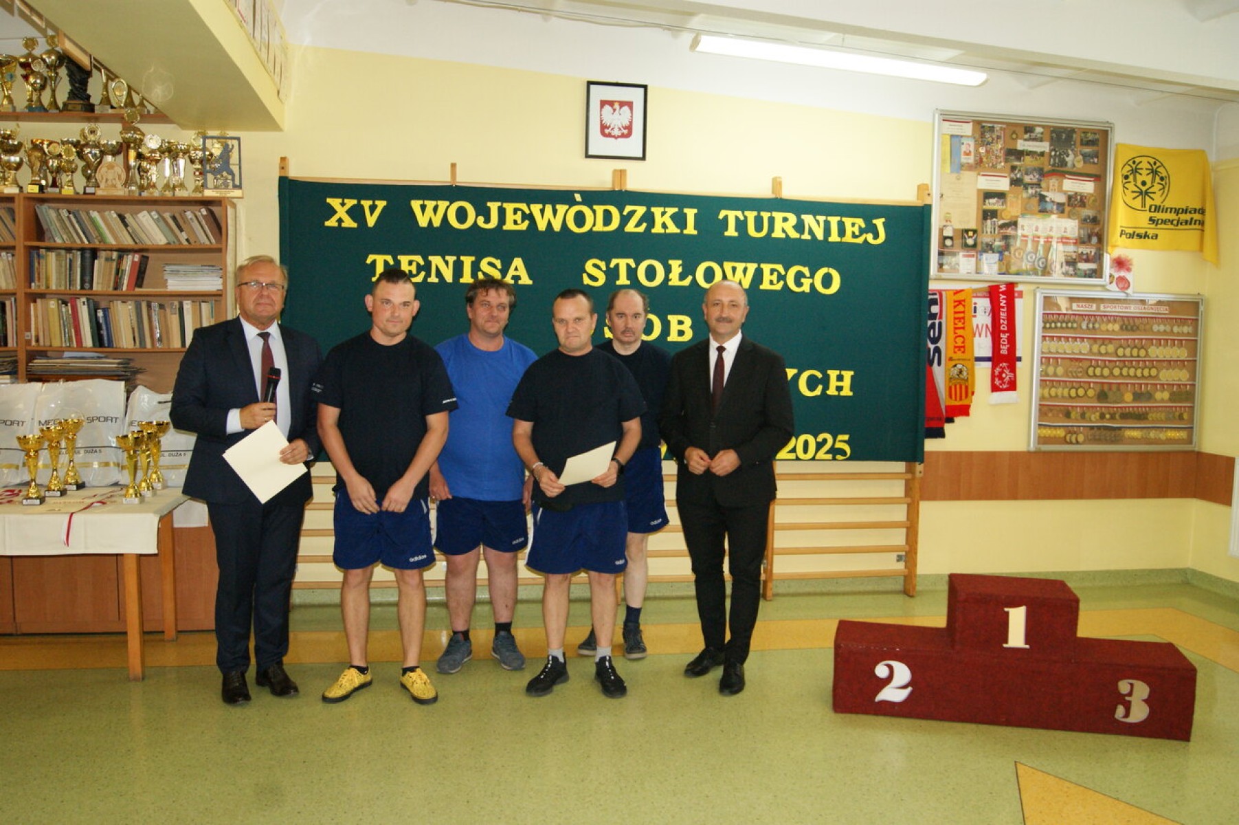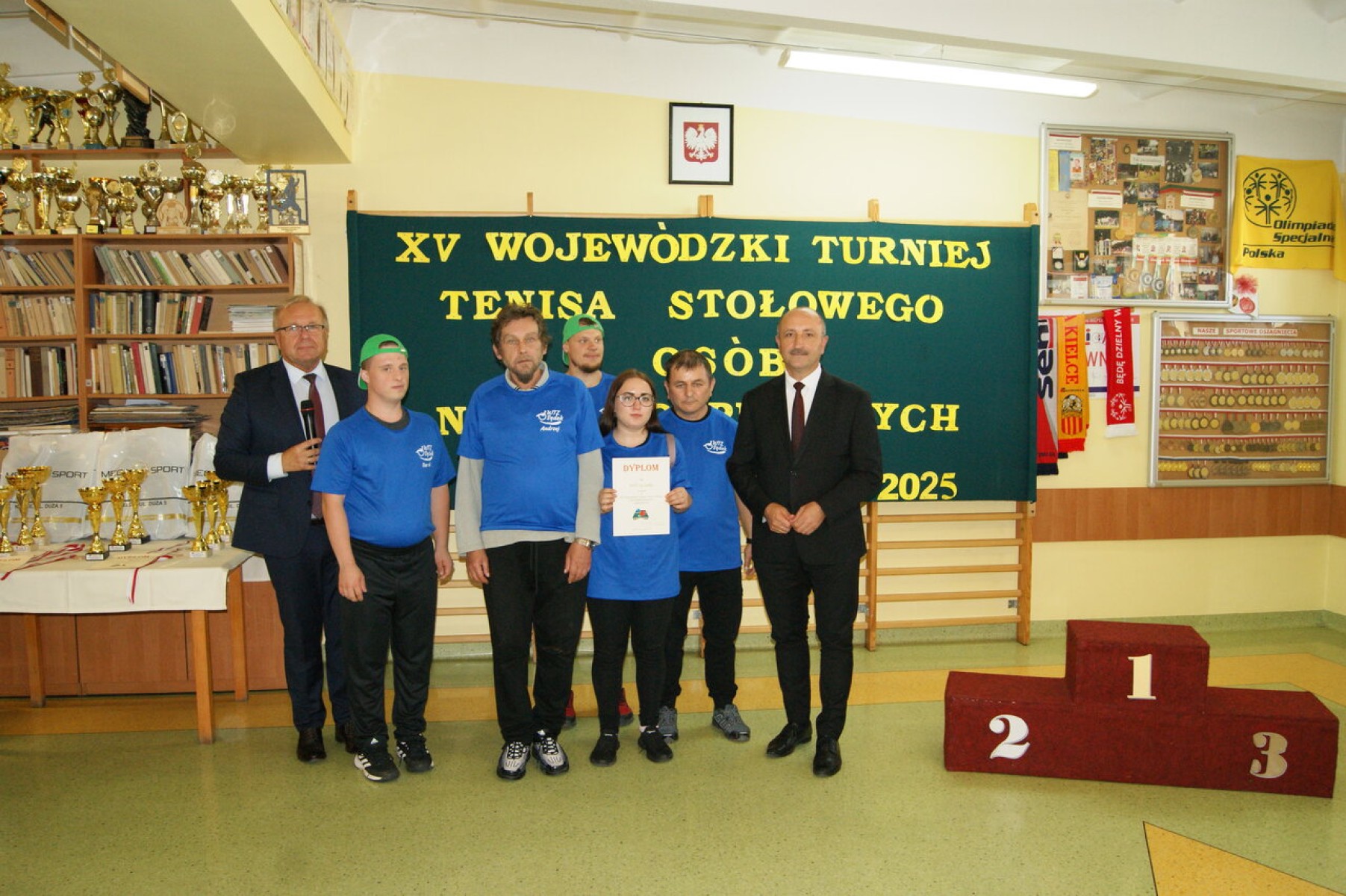 Dyplomy za udział w Turnieju, medale, puchary i nagrody rzeczowe najlepszym zawodnikom wręczył Członek Zarządu Powiatu Mariusz Ściana gratulując im sukcesu w tegorocznych zmaganiach. Dyplom dla najstarszego zawodnika otrzymał Pan Stanisław Kwiecień z ŚDS w Zreczu Dużym, który w wieku 85 lat aktywnie uczestniczy w wydarzeniach sportowych organizowanych przez placówki pomocy społecznej.